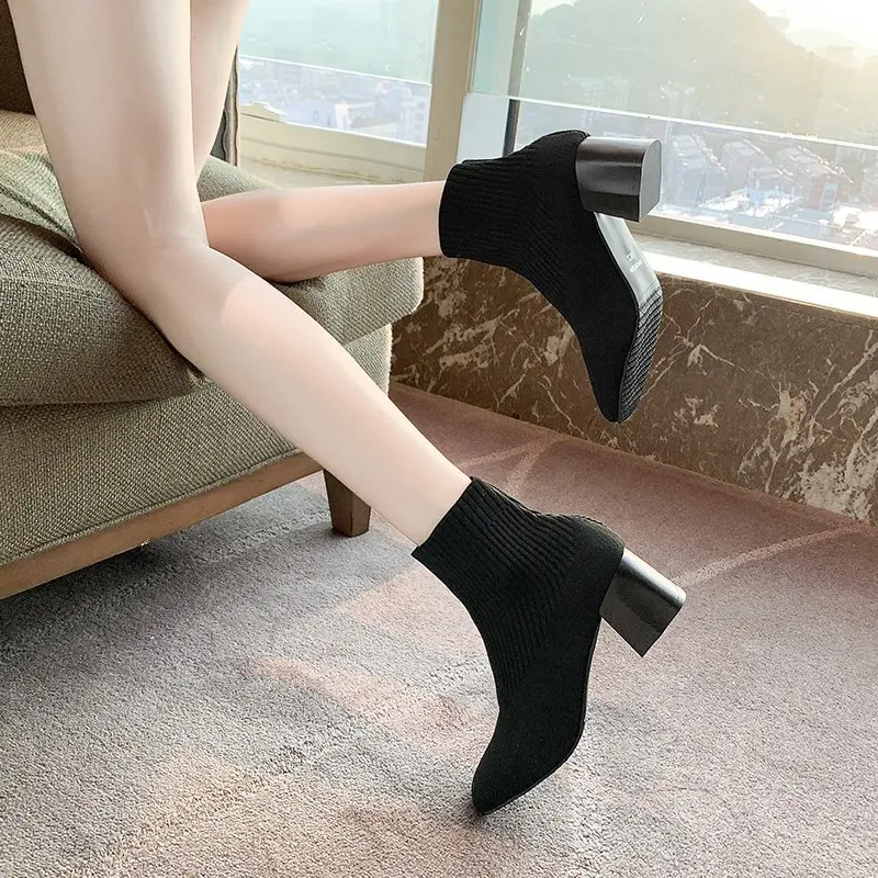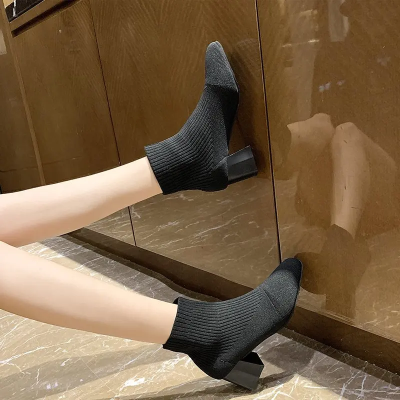 Women's Elastic Socks Square Heel Knitted Ladies Footwear